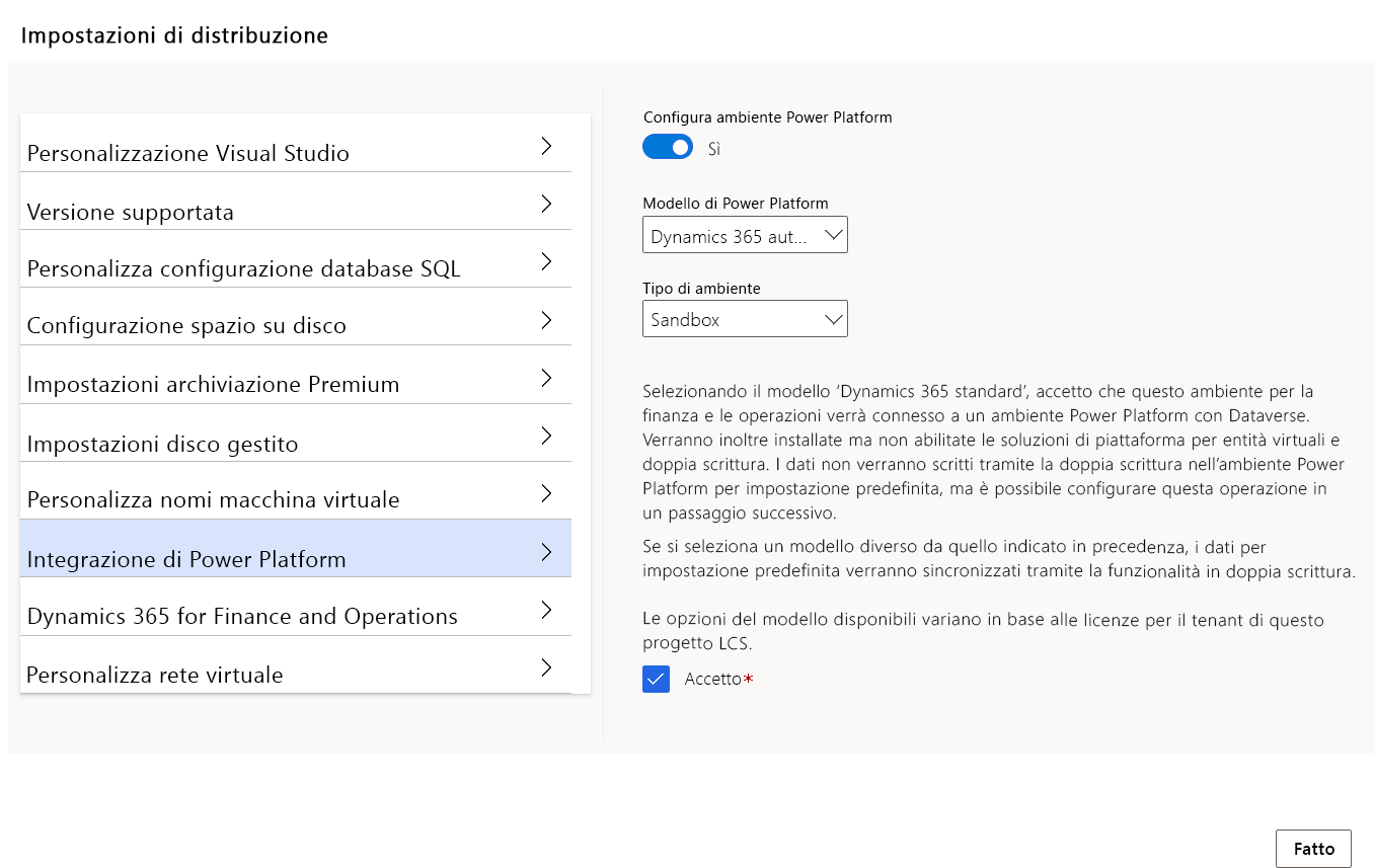 Per gli ambienti di livello 1, quando si distribuisce l'ambiente in Microsoft Dynamics 365 Lifecycle Services, passare a Impostazioni avanzate>Integrazione di Power Platform. Nella finestra Impostazioni distribuzione impostare l'interruttore Configura l'ambiente Power Platform su Sì, selezionare il Modello Power Platform e il Tipo di ambiente applicabili, quindi selezionare la casella di controllo Accetto, come illustrato nell'immagine seguente.