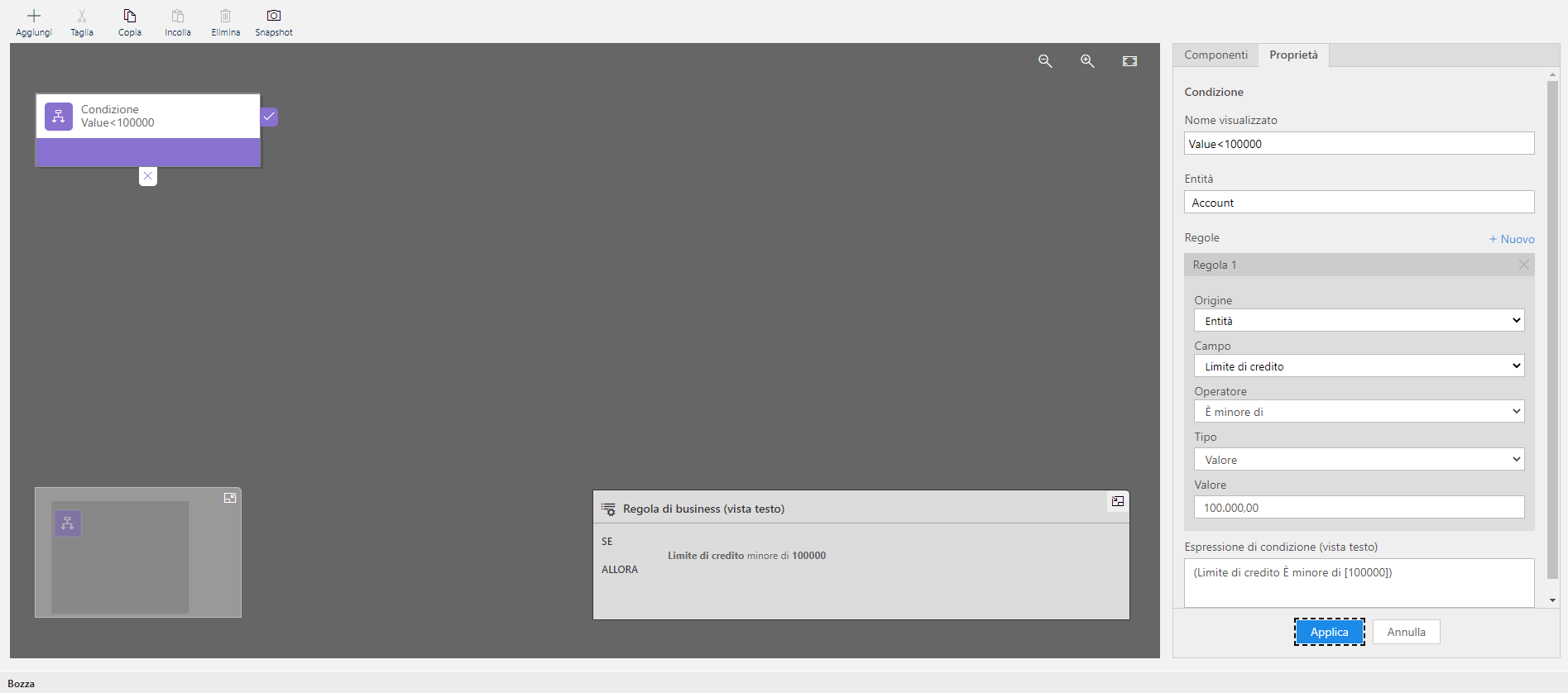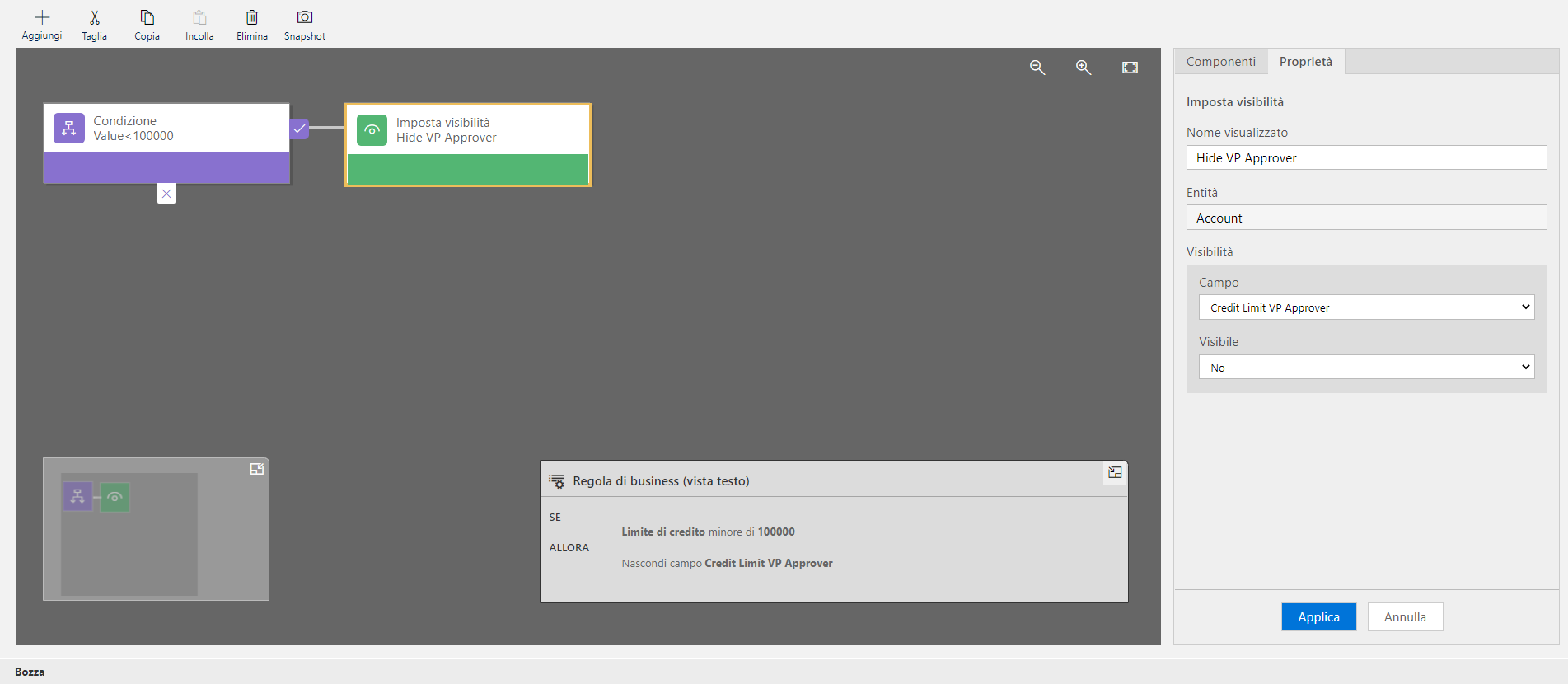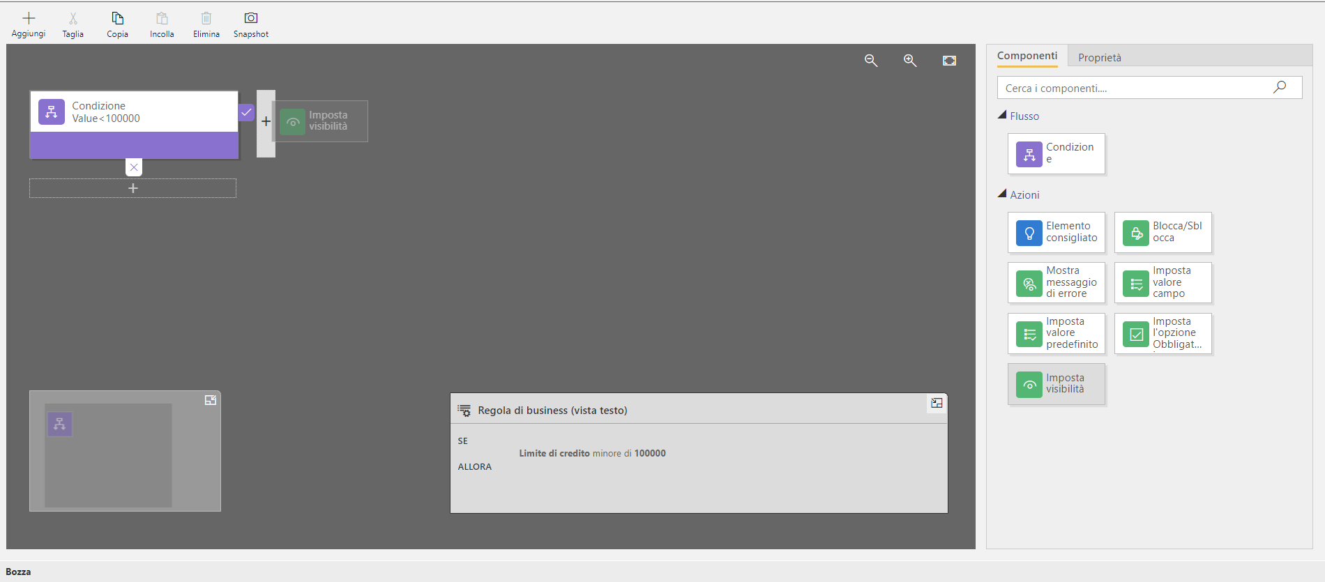 Snapshot - Per creare uno snapshot di tutti gli elementi nella finestra Regola di business, selezionare Snapshot sulla barra delle azioni. Ciò è utile se si vuole ad esempio condividere la regola di business con un membro del team e ricevere commenti.