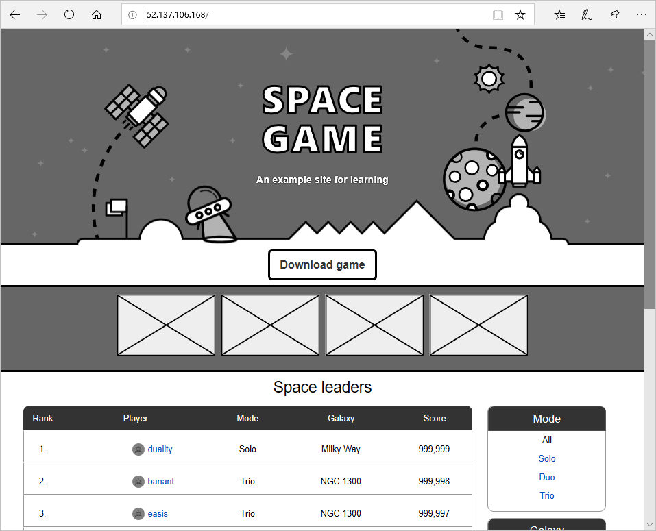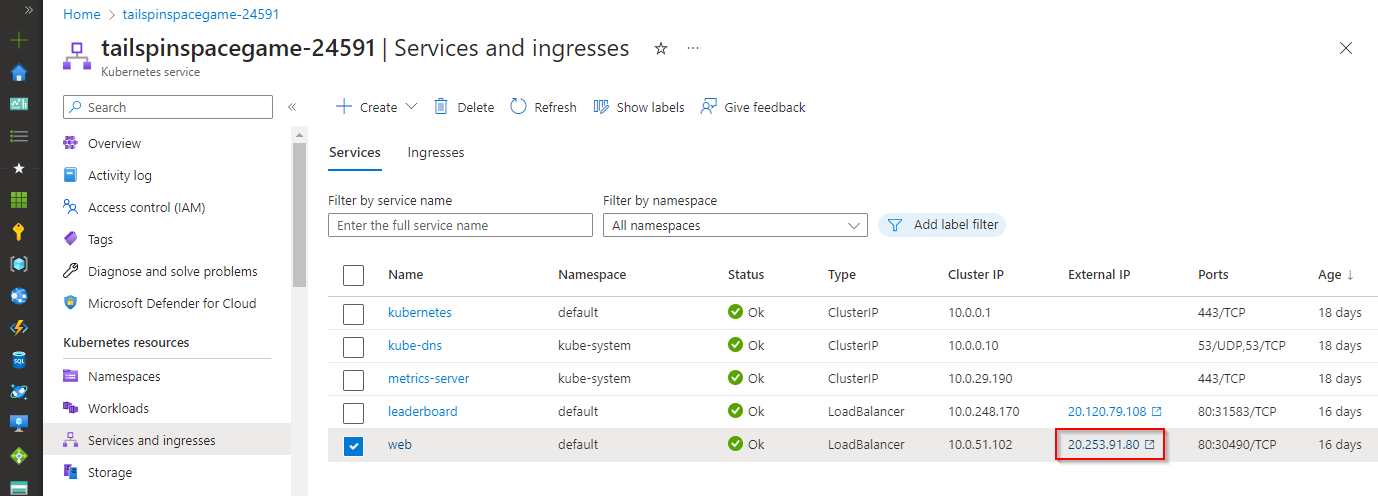 A questo punto, è necessario verificare l'app Web distribuita e l'endpoint API. A tale scopo, occorre recuperare gli indirizzi IP esterni sia per i servizi Web che per i servizi del tabellone punteggi.