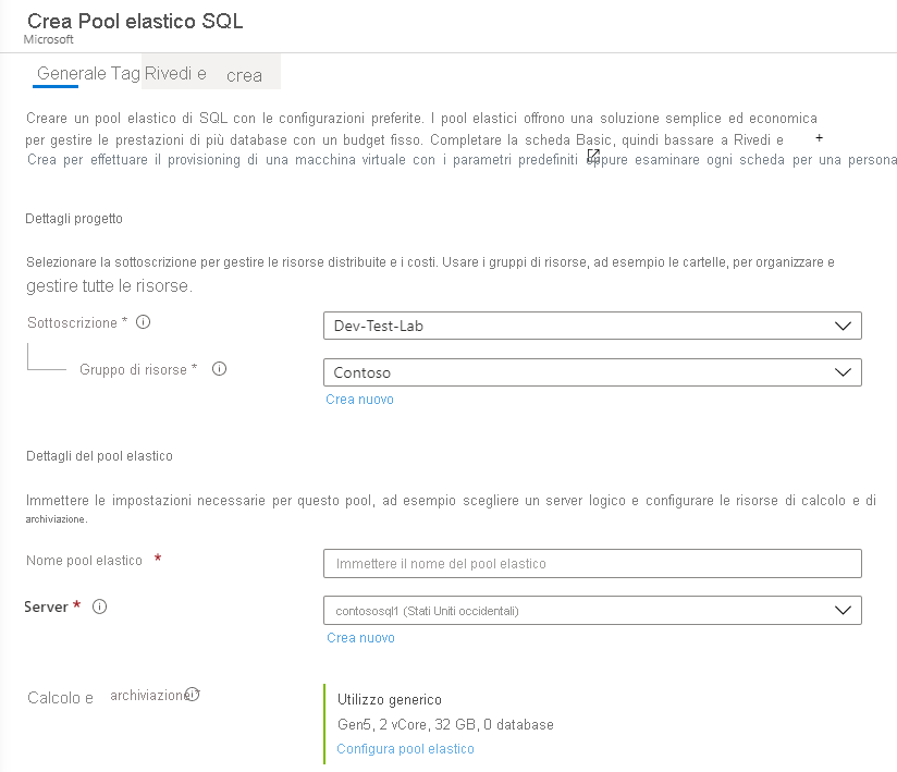 Usando il portale di Azure, cercare "pool elastici SQL". Selezionare quindi Crea per aprire la pagina Crea pool elastico SQL.
