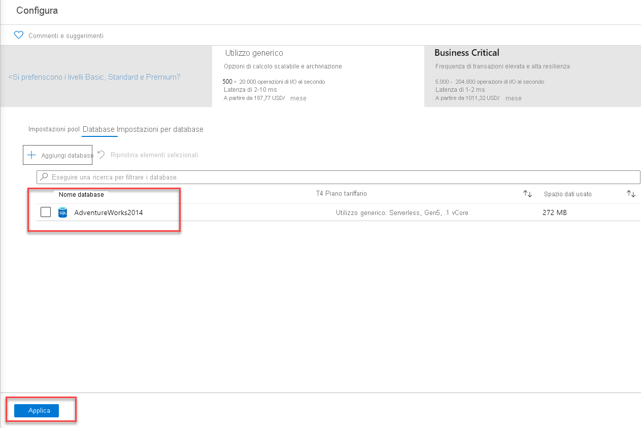 Selezionare + Aggiungi database per aggiungere il database al pool e quindi selezionare Applica.