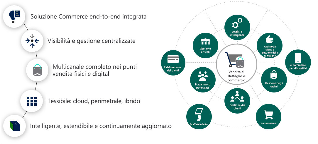 L'immagine seguente mostra una panoramica delle funzionalità di Commerce e di come si integrano tra loro per creare un quadro completo dell'attività.