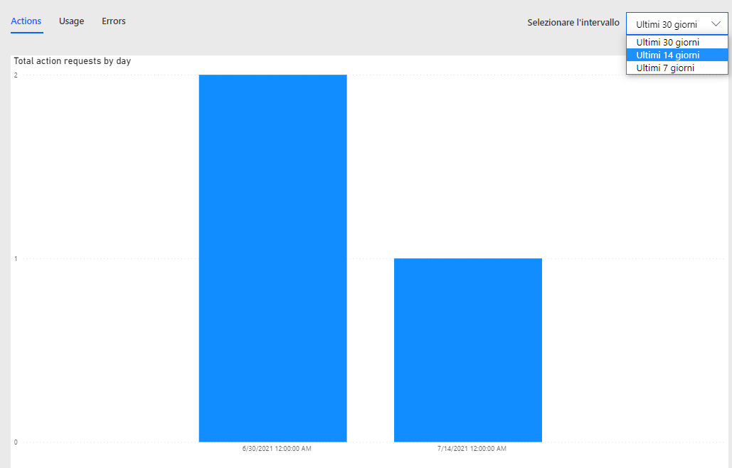Le analisi Utilizzo forniscono una panoramica dettagliata di tutti i flussi eseguiti nell'intervallo selezionato. Questi oggetti visivi offrono un quadro generale del numero totale di flussi eseguiti e di quanti sono stati eseguiti correttamente o meno. È possibile modificare l'intervallo per visualizzare gli ultimi 30, 14 o 7 giorni.