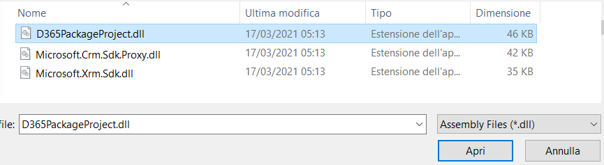 Andare alla cartella debug del progetto, selezionare D365PackageProject.dll, quindi selezionare Apri.