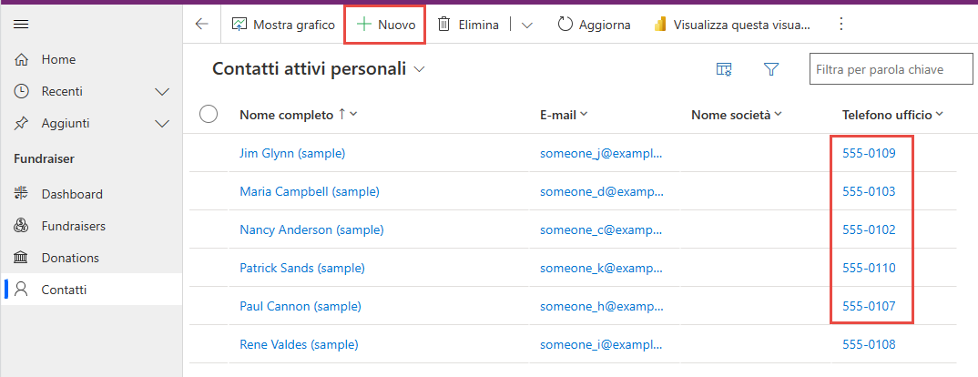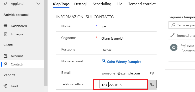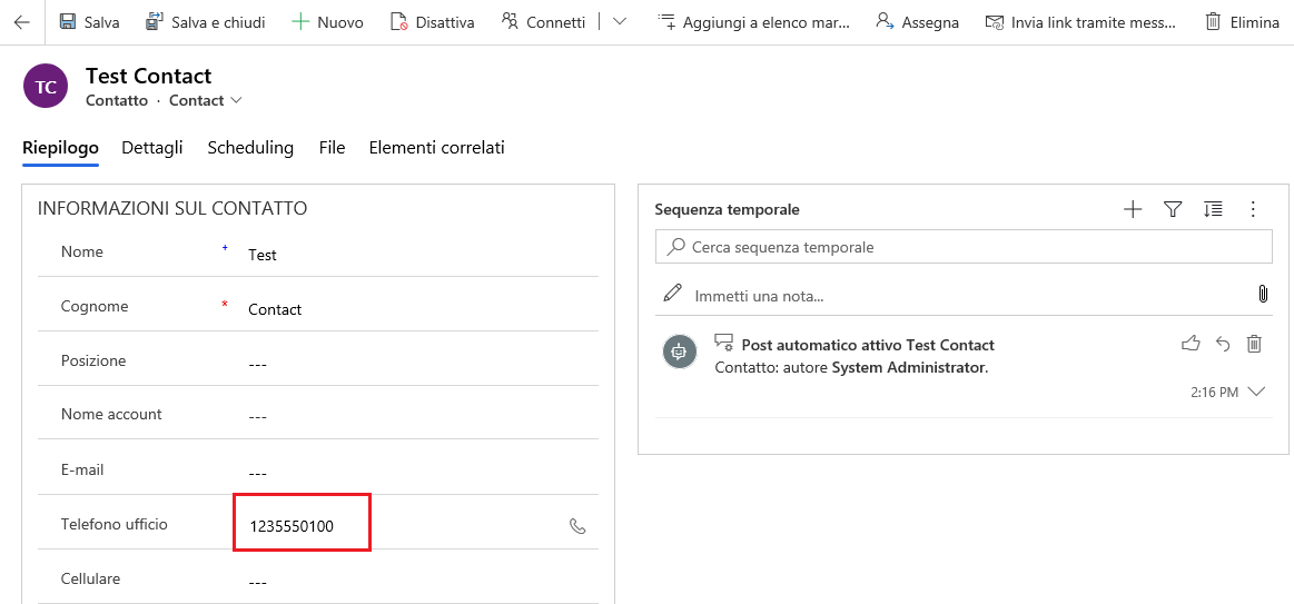 A questo punto, il record dovrebbe essere stato salvato e nel campo Telefono ufficio dovrebbero essere visualizzati solo valori numerici.