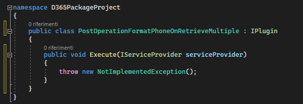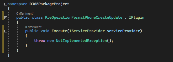 using Microsoft.Xrm.Sdk;Impostare la classe come pubblica e implementare l'interfaccia IPlugin.
