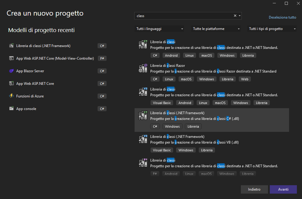 Selezionare Libreria di classi (.NET Framework) e selezionare Avanti.