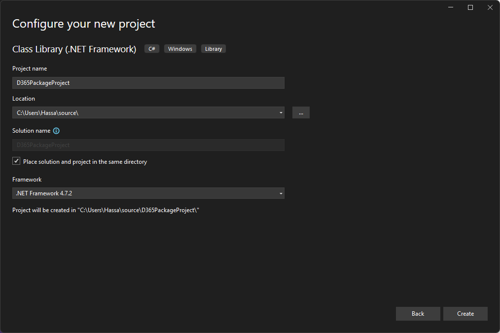 Immettere D365PackageProject nel campo Nome progetto, selezionare una posizione in cui salvare il progetto, selezionare .NET Framework 4.6.2 nel campo Framework, quindi selezionare Crea.