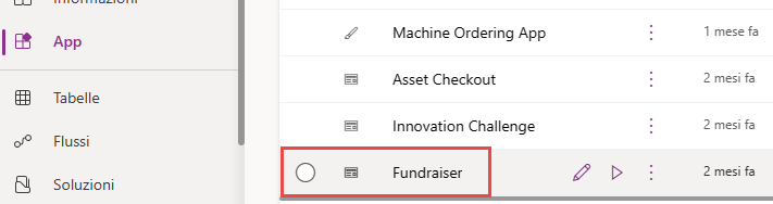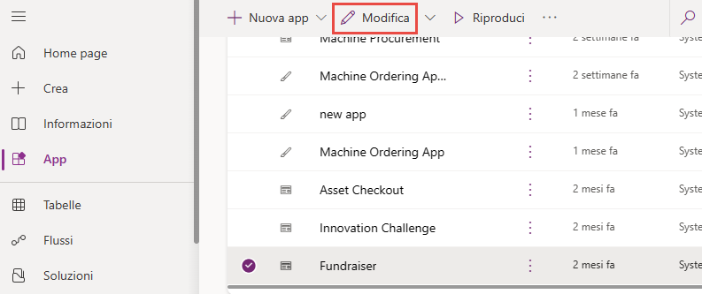 Selezionare App. Selezionare l'applicazione Fundraiser, quindi selezionare Modifica. Si aggiungerà la tabella Contact all'applicazione.
