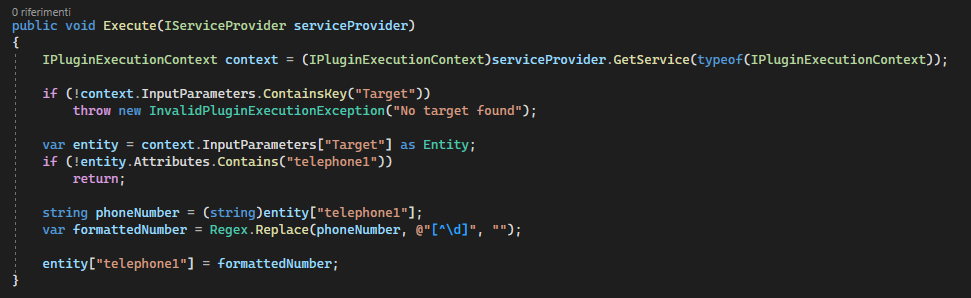 var entity = context.InputParameters["Target"] as Entity; if (!entity.Attributes.Contains("telephone1")) return;Aggiungere il seguente frammento di codice alla funzione Execute. Questo frammento di codice rimuove tutti i caratteri non numerici dal numero di telefono fornito dall'utente.