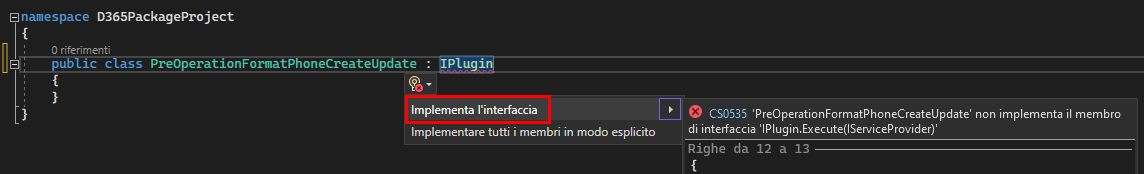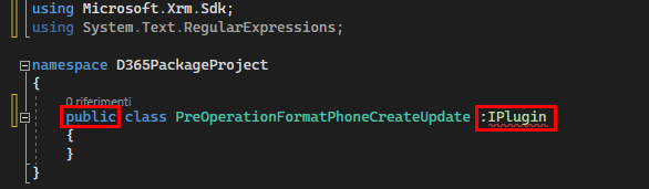 using Microsoft.Xrm.Sdk; using System.Text.RegularExpressions;Impostare la classe come pubblica e implementare l'interfaccia IPlugin.