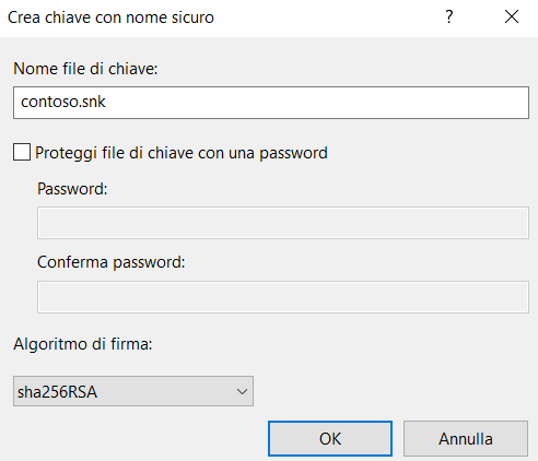 Immettere contoso.snk nel campo Nome file di chiave, deselezionare la casella di controllo Proteggi file di chiave con una password, quindi selezionare OK.