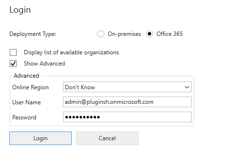 Selezionare Office 365, selezionare la casella di controllo Mostra avanzate, specificare le credenziali e quindi selezionare Accedi.