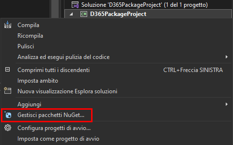 Fare clic con il pulsante destro del mouse sul progetto e selezionare Gestisci pacchetti NuGet.