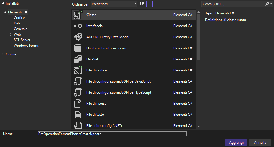 Alla nuova classe assegnare il nome PreOperationFormatPhoneCreateUpdate e selezionare Aggiungi.