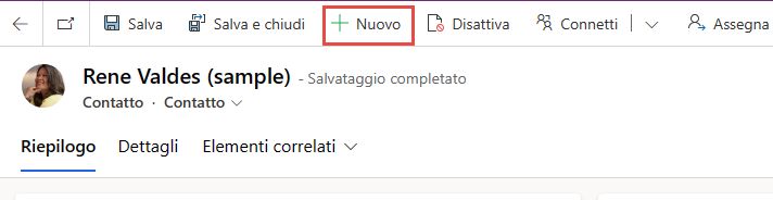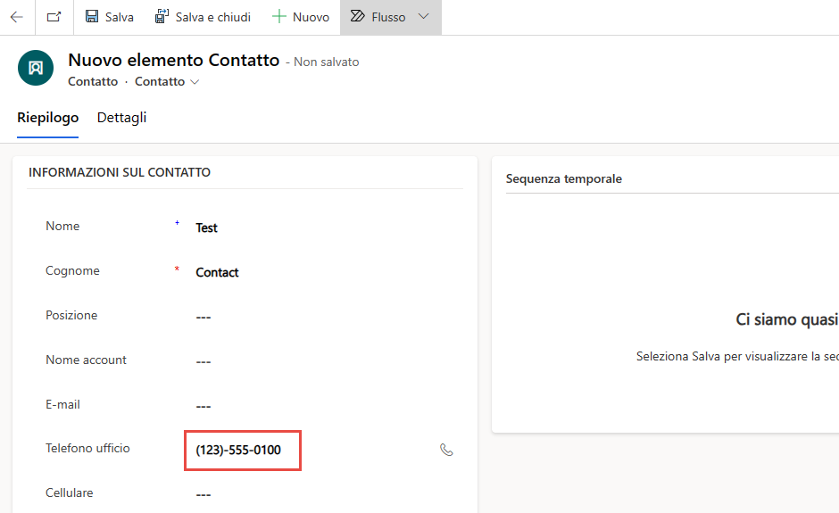 Immettere Test nel campo Nome, Contatto nel campo Cognome, (123)-555-0100 nel campo Telefono ufficio, quindi selezionare Salva.