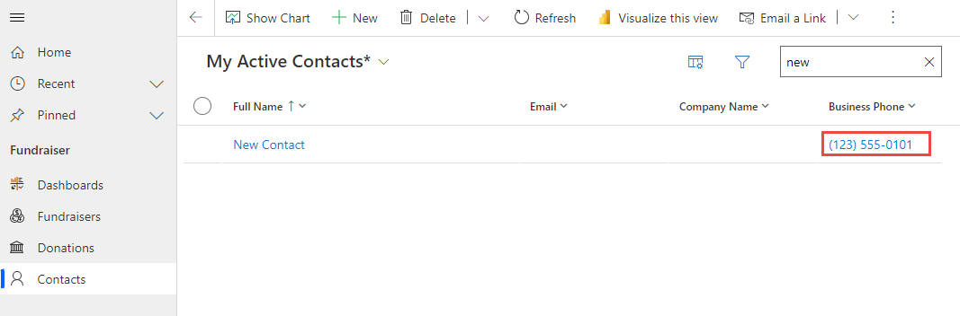 Selezionare di nuovo Contatti. Il record creato dovrebbe avere il nuovo formato.