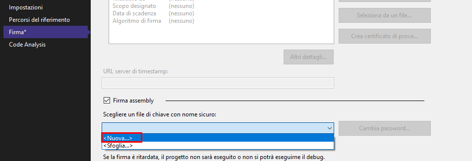 Selezionare la scheda Firma, selezionare la casella Firma assembly, quindi scegliere Nuovo file chiave.