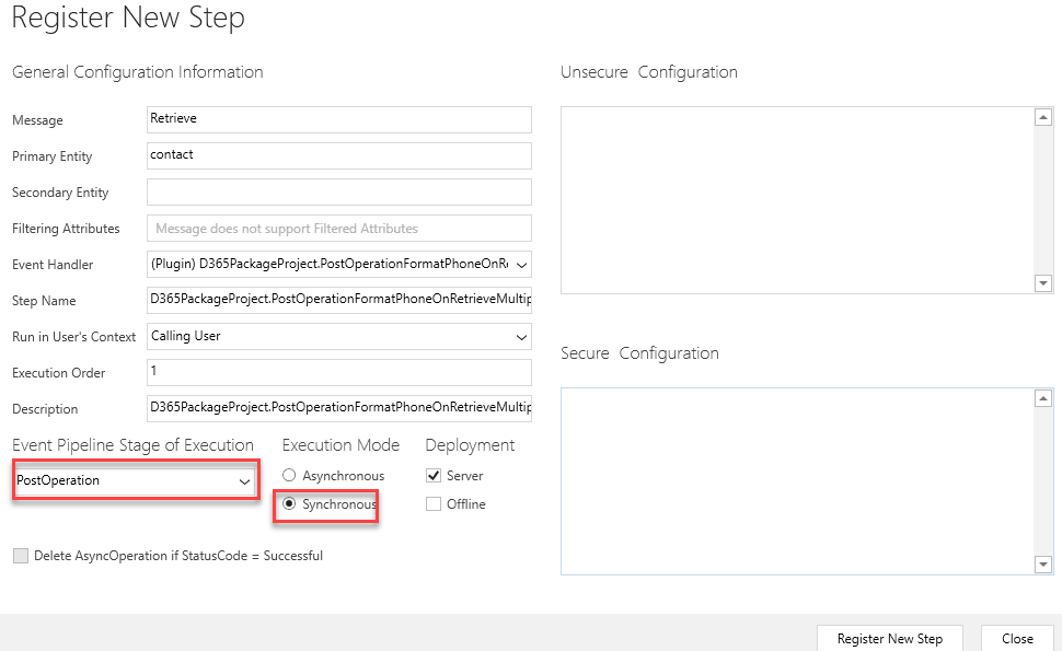 Selezionare RetrieveMultiple nel campo Messaggio, selezionare contatto nel campo Entità primaria e selezionare PostOperation nel campo Fase di esecuzione pipeline eventi. Assicurarsi di aver selezionato Sincrona nel campo Modalità di esecuzione e quindi selezionare Registra nuovo passaggio.