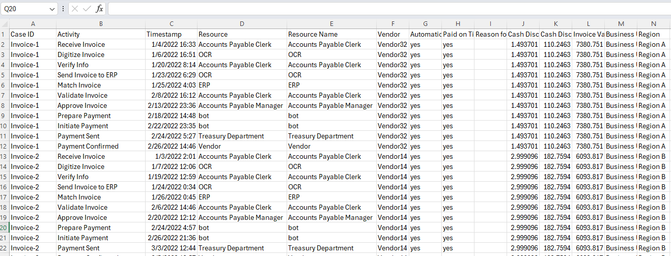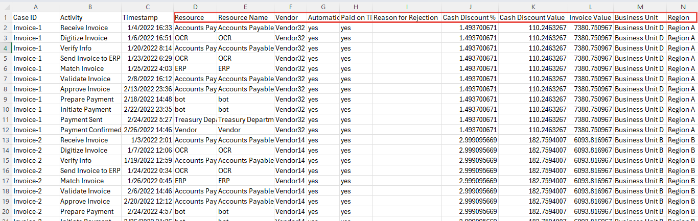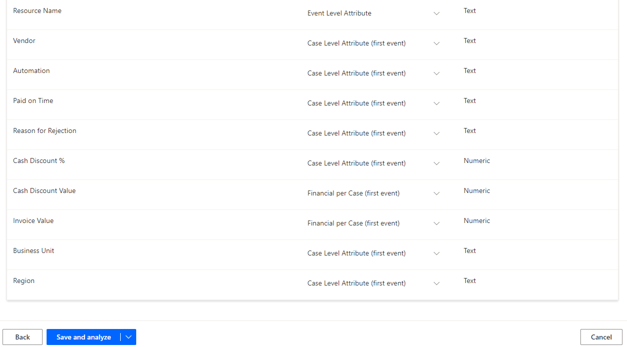 Nome attributo Tipo di attributo Tipo di dati attributo Resource Resource Testo Resource Name Event Level Attribute Testo Vendor Case Level Attribute (first event) Testo Automation Case Level Attribute (first event) Testo Paid on Time Case Level Attribute (first event) Testo Reason for Rejection Case Level Attribute (first event) Testo Cash Discount % Case Level Attribute (first event) Numerico Cash Discount Value Financial per Case (first event) Numerico Invoice Value Financial per Case (first event) Numerico Business Unit Case Level Attribute (first event) Testo Region Case Level Attribute (first event) Testo Dopo aver eseguito il mapping dei campi, selezionare Salva e analizza.