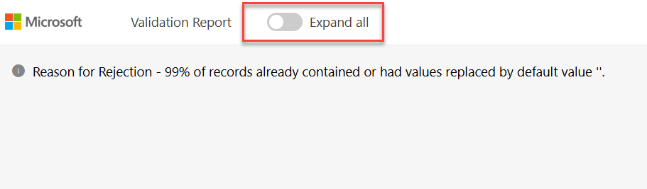 Per impostazione predefinita, il report mostra un riepilogo della convalida. L'immagine seguente presenta un riepilogo che mostra il campo Reason for Rejection con un valore pari al 99% dei record già contenuti o con valori sostituiti dal valore predefinito.