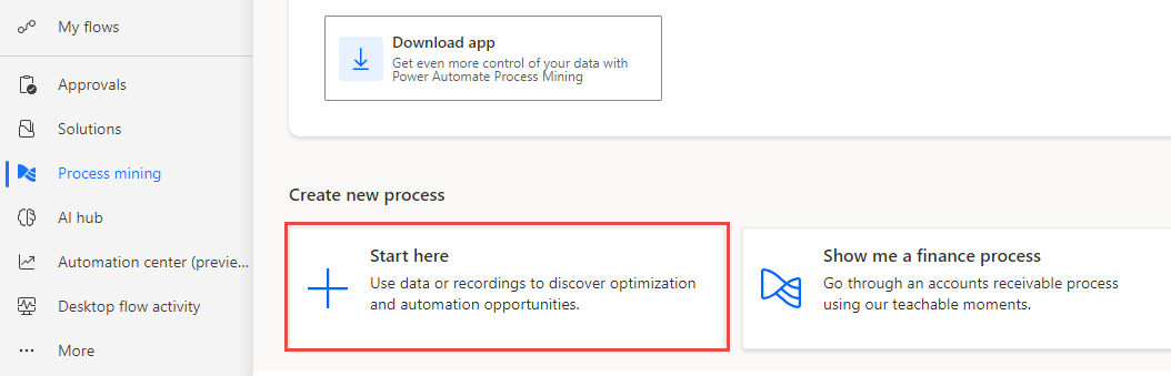 Selezionare Mining dei processi dal riquadro di sinistra, quindi + Inizia qui.