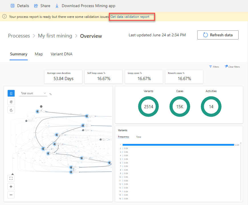 Nella parte superiore della panoramica, individuare la notifica del report di convalida dei dati, quindi selezionare Ottieni report di convalida dei dati.