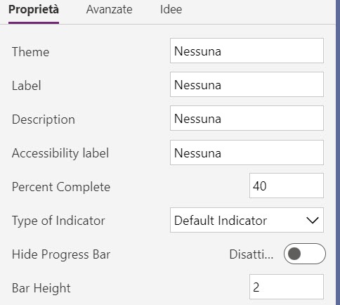 Quando un autore configura un componente di codice, le proprietà definite nel manifesto sono disponibili per la configurazione. Questa immagine mostra come si presenta a un autore il manifesto precedente per un componente indicatore di avanzamento nella finestra di progettazione dell'applicazione. Gli consente di vedere e personalizzare le proprietà disponibili.
