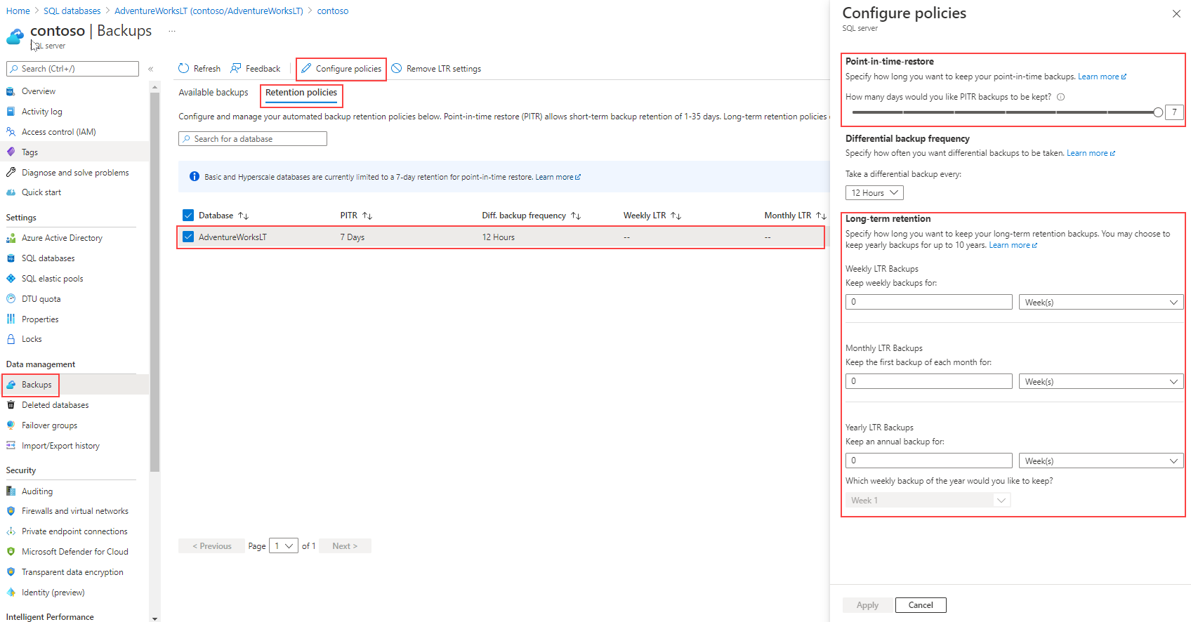 Il database SQL di Azure garantisce backup regolari, copiandoli continuamente nello spazio di archiviazione con ridondanza geografica e accesso in lettura (RA-GRS). Vengono eseguiti backup completi ogni settimana, backup differenziali a intervalli compresi tra le 12 e le 24 ore e backup dei log delle transazioni a intervalli compresi tra 5 e 10 minuti.
