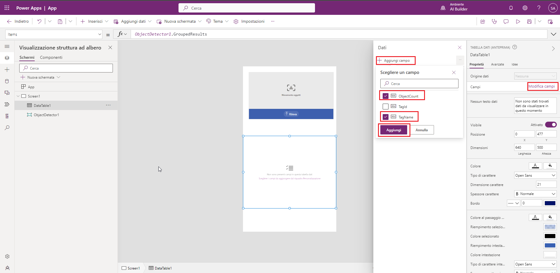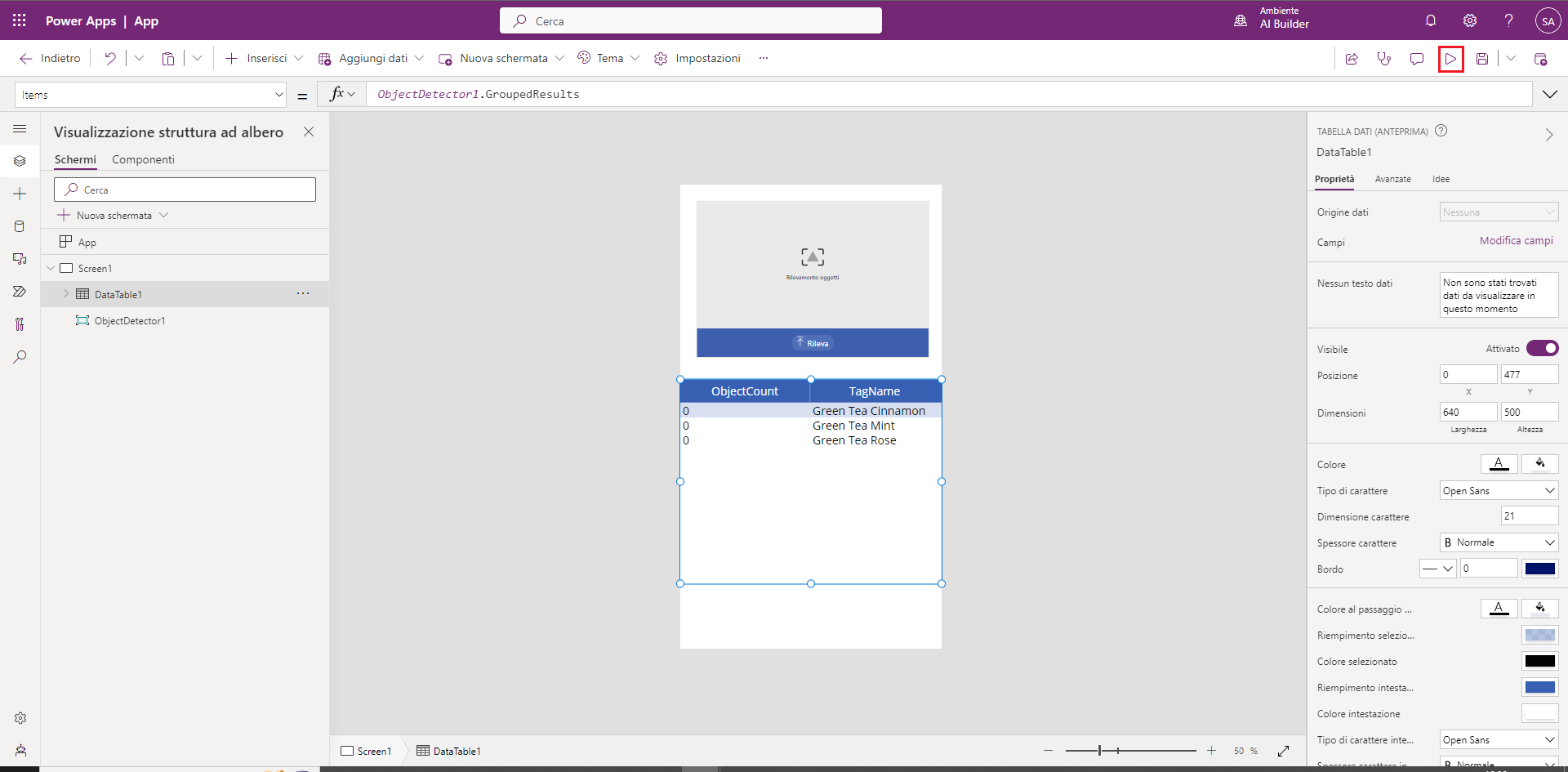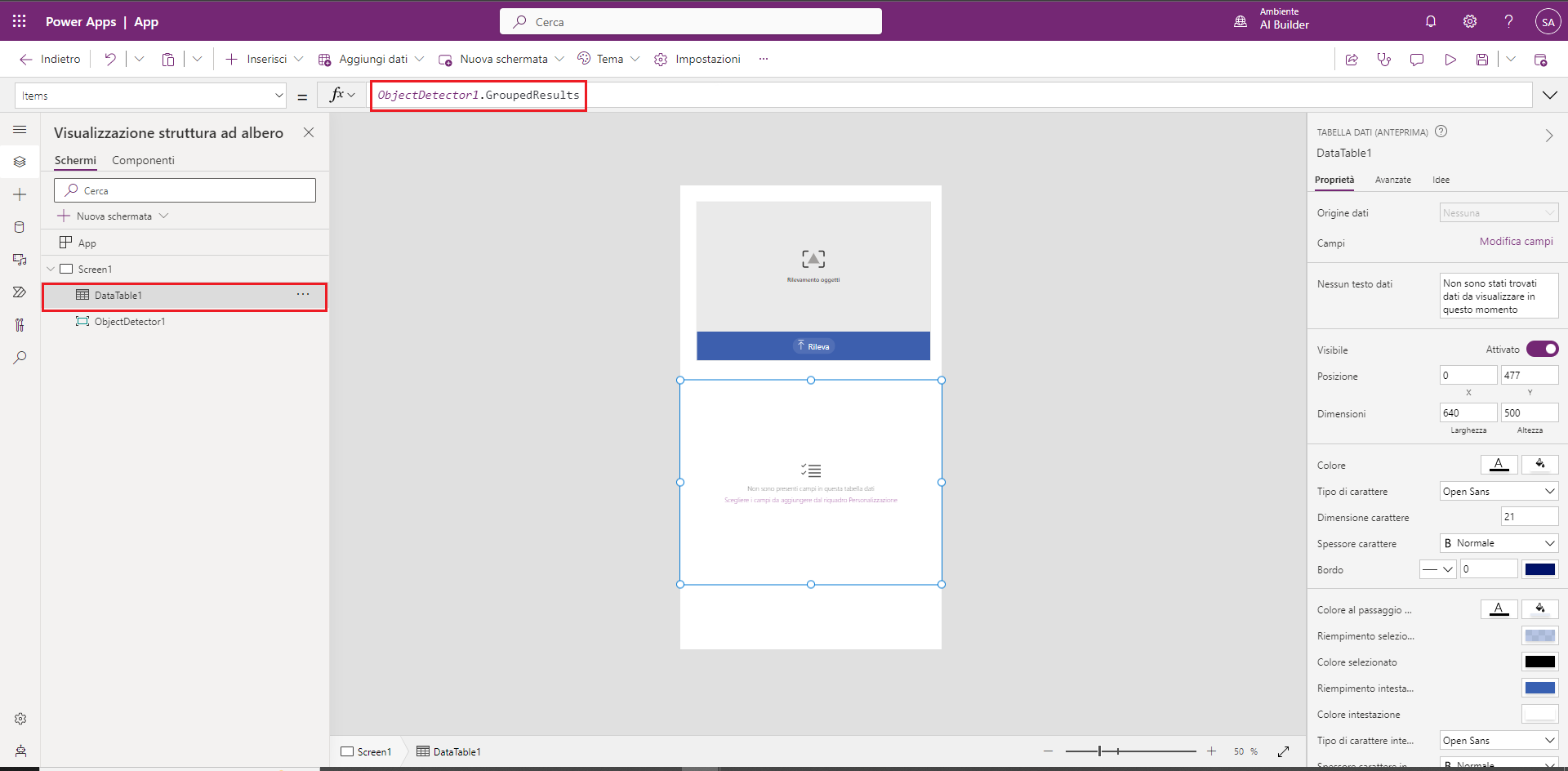 Per associare il componente Rilevatore oggetti a una delle tabelle dati, selezionare il componente DataTable1 della tabella dati e sostituire il valore della barra della formula con ObjectDetector1.GroupedResults.