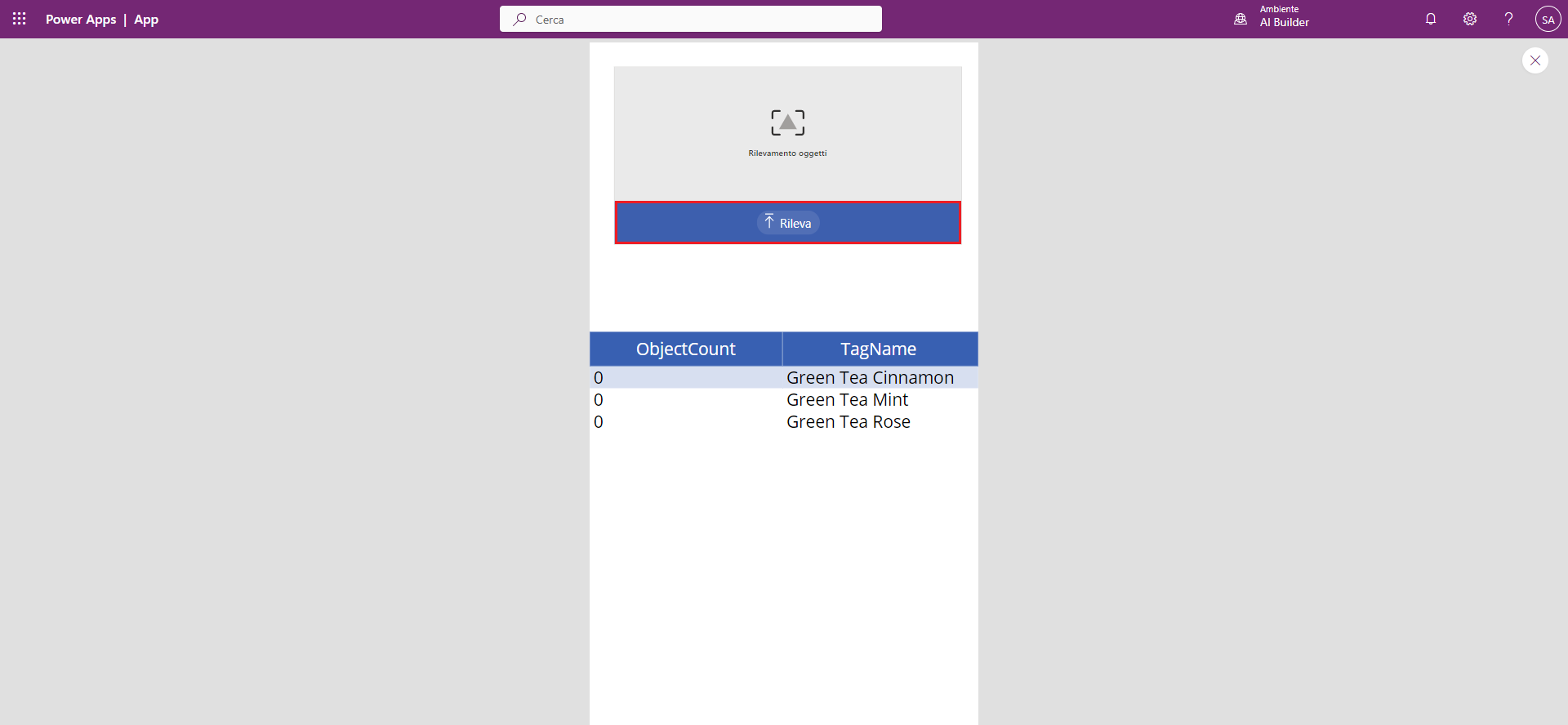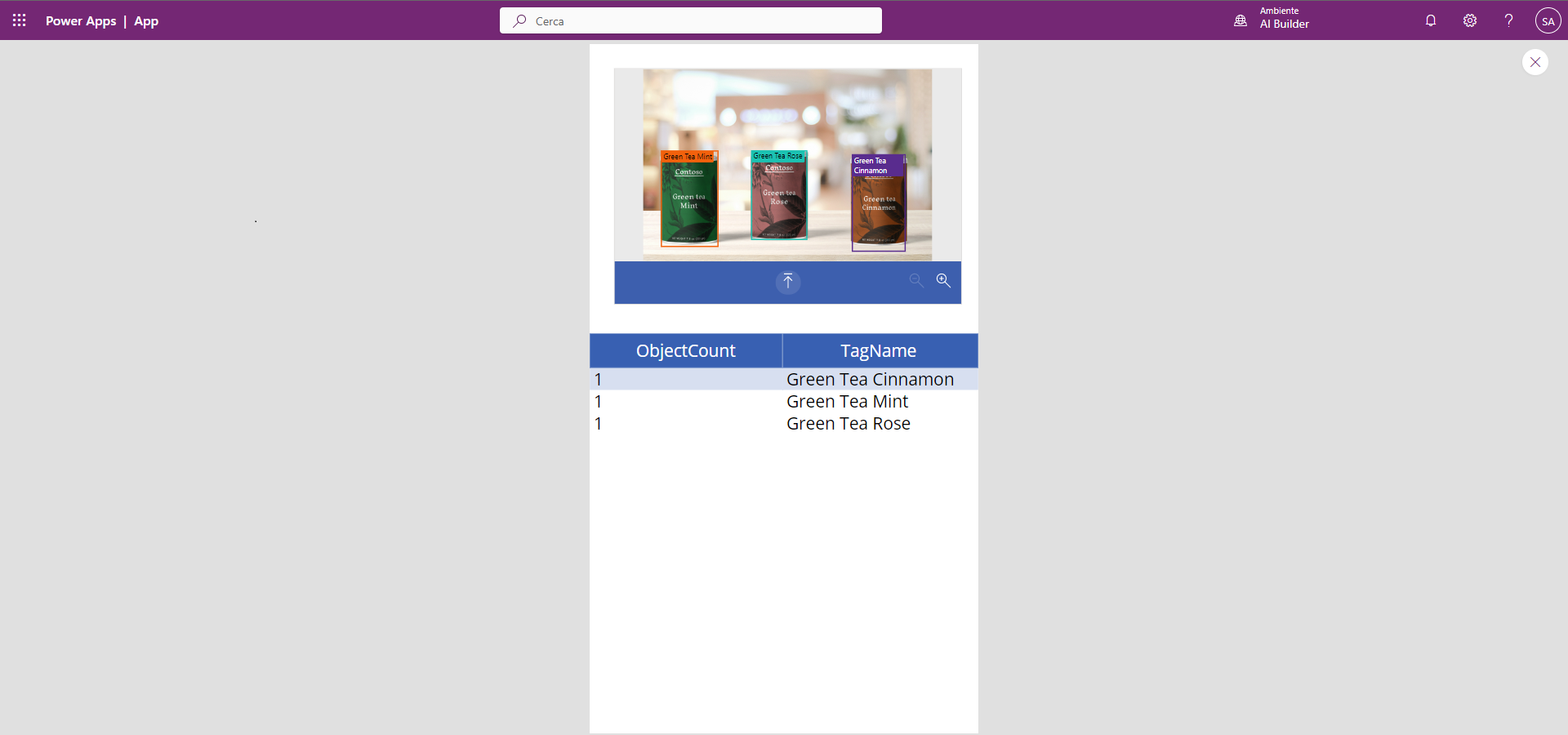Nell'app canvas si aggiunge automaticamente e si collega un componente di rilevamento oggetti al modello di rilevamento oggetti pubblicato (Tè verde rilevamento oggetti in questo esempio). In seguito, è possibile selezionare Inserisci > AI Builder per visualizzare l'elenco dei componenti di AI Builder, quindi selezionare Rilevatore oggetti per aggiungere un componente rilevatore di oggetti. Assicurarsi di selezionare il modello corretto perché solo i modelli pubblicati sono visualizzati nell'elenco a discesa.
