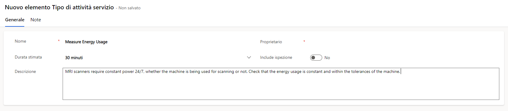 In Dynamics 365 Field Service è possibile usare i tipi di attività di servizio per definire i tipi di attività di servizio da includere nei tipi di incidente e negli ordini di lavoro. Ai tipi di attività di servizio è possibile assegnare una durata che si protrae fino alla durata del tipo di incidente e alla durata dell'ordine di lavoro.