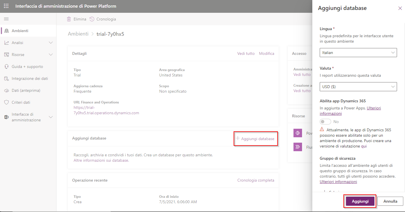 Ora che ci si trova nell'ambiente scelto, aggiungere un database selezionando Aggiungi database. Nella finestra di dialogo successiva è possibile specificare i valori richiesti, ma in questo caso si manterranno i valori predefiniti. Selezionare Aggiungi. È possibile che venga chiesto di effettuare nuovamente l'accesso prima di creare il database, dopodiché il database dovrebbe eseguire il provisioning in modo appropriato.