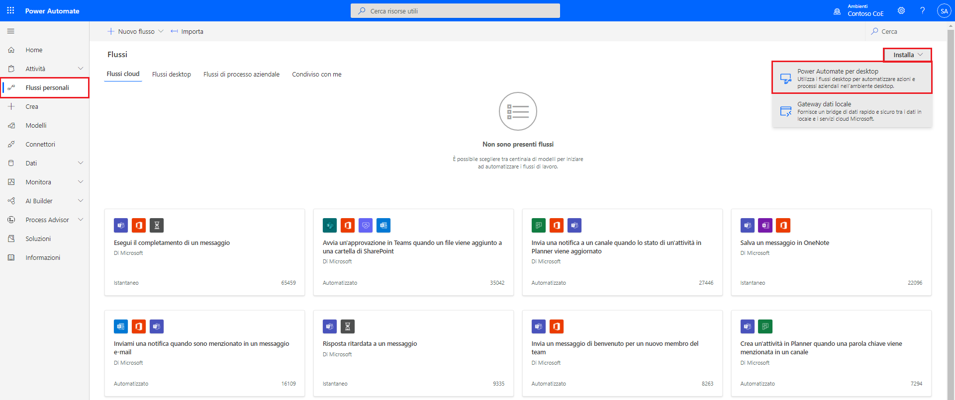 Andare alla pagina Power Automate e accedere con l'account usato per creare l'ambiente e il database. Dopo avere effettuato l'accesso, selezionare Flussi personali > Installa > Power Automate Desktop.