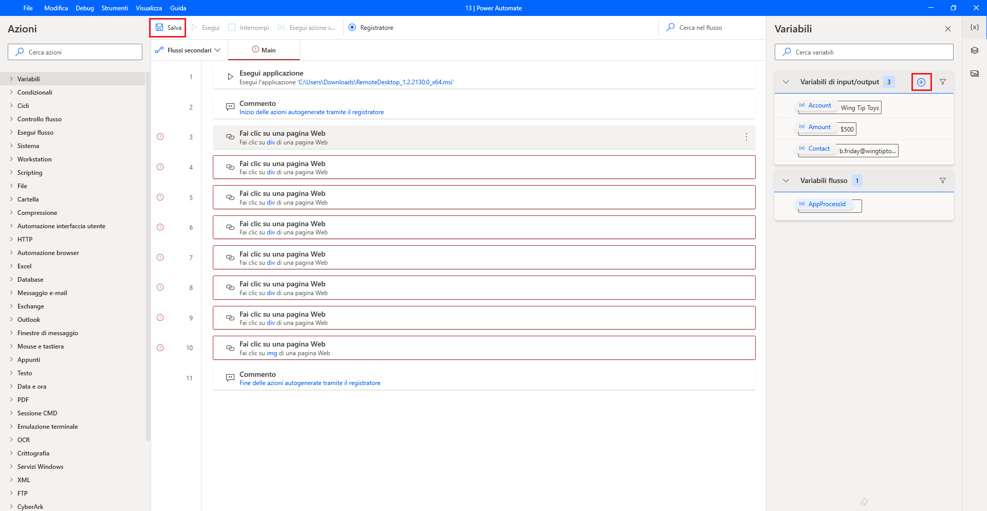 Le variabili consentono la modifica (o la variazione) delle informazioni per ogni esecuzione del flusso. Se si sta usando un flusso per un tipo di immissione di dati, le variabili sono necessarie per definire i campi da compilare. Le variabili di input includono informazioni immesse nel flusso prima o durante l'esecuzione. Le variabili di output sono i risultati che il flusso restituisce dopo l'esecuzione. Power Automate Desktop offre la possibilità di ricevere valori di input dai flussi cloud e restituire valori mediante variabili di output. Di conseguenza, le automazioni possono essere integrate senza problemi. Per definire le variabili di input, iniziare nell'app Power Automate Desktop, quindi aprire la finestra di progettazione modificando un flusso desktop.