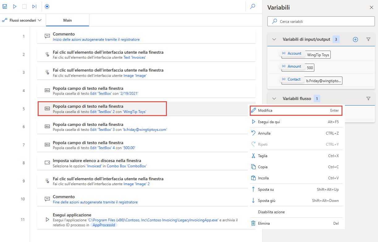 Per usare le variabili di input, determinare in quale passaggio del flusso si useranno i dati e quindi modificare tale passaggio. Se si usa il flusso desktop creato mediante l'app Contoso Invoicing, il primo passaggio che richiede una variabile è il passaggio 5. Selezionare i puntini di sospensione (...) a destra del passaggio, quindi Modifica.