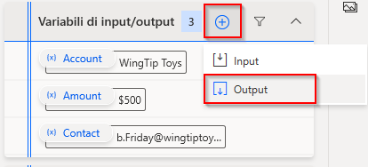 Per definire una variabile di output, selezionare l'icona con il segno più (+) accanto alla sezione Variabili di input/output e quindi selezionare Output.