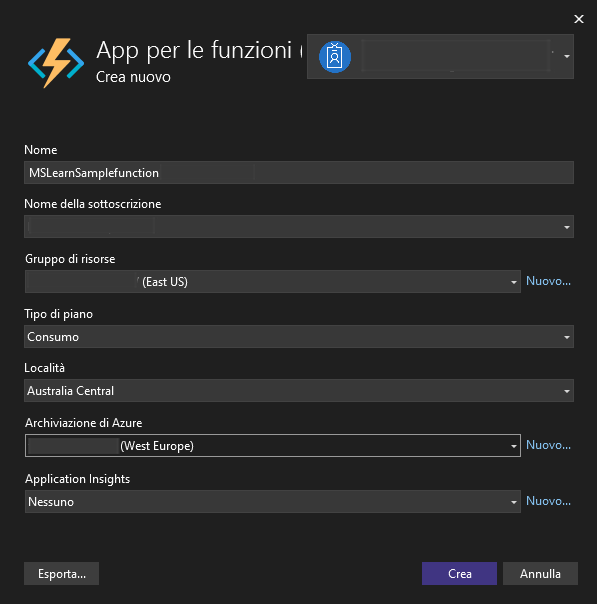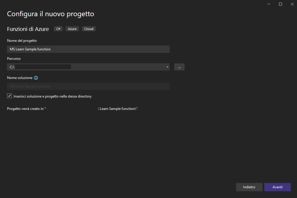 Questa lezione non tratta i dettagli relativi alla creazione di un nuovo assembly di Funzioni di Azure.