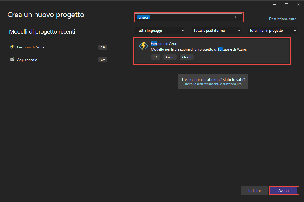Per creare un nuovo progetto di funzione di Azure, usare il modello Funzioni di Azure. Il modello è disponibile quando si crea un nuovo progetto e quindi si digita "funzione" nella barra di ricerca.