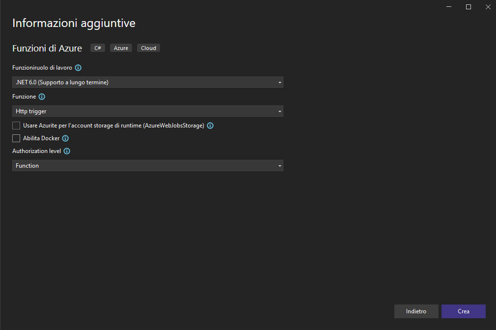 Selezionare .NET Core LTS più recente, selezionare Trigger HTTP, deselezionare la casella di controllo Usa Azurite, selezionare Funzione per Livello di autorizzazione e selezionare Crea.