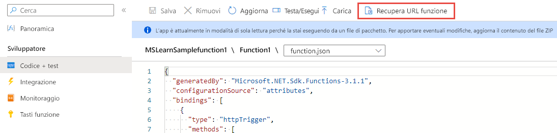Per recuperare l'URL della Funzione dal portale di Azure, selezionare Recupera URL della funzione.