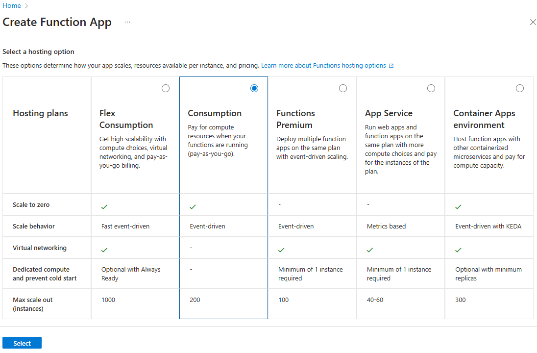 Scegliere il piano di hosting con cui dovrà essere eseguita l'app. Quindi, scegliere Seleziona.
