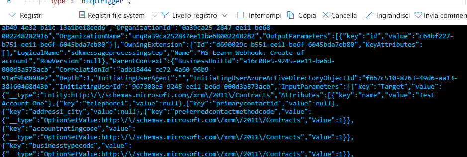 log.LogInformation("C# HTTP trigger function processed a request."); string queryParams = ""; foreach (var q in req.Query) { queryParams += $"Key: {q.Key} Value: {q.Value}\n"; } string requestBody = await new StreamReader(req.Body).ReadToEndAsync(); dynamic data = JsonConvert.DeserializeObject(requestBody); string requestHeader = ""; foreach (var h in req.Headers) { requestHeader += $"Key: {h.Key} Value: {h.Value}\n"; } log.LogInformation("Query Parameters:\n" + queryParams); log.LogInformation("Request Header: \n" + requestHeader); log.LogInformation("Request Body:\n" + requestBody); string requestBodyFormatted = JValue.Parse(requestBody).ToString(Formatting.Indented); log.LogInformation("Request Body Formatted:\n" + requestBodyFormatted); try { dynamic target = data.InputParameters["Target"]; foreach (dynamic field in target.Attributes) { log.LogInformation($"Name: {field.Key} Value: { field.Value}"); } } catch (Exception ex) { log.LogInformation(ex.ToString()); } return (ActionResult)new OkObjectResult(data.InitiatingUserId);Creare la funzione e pubblicarla in Azure facendo clic con il pulsante destro del mouse sul progetto e selezionando Pubblica.