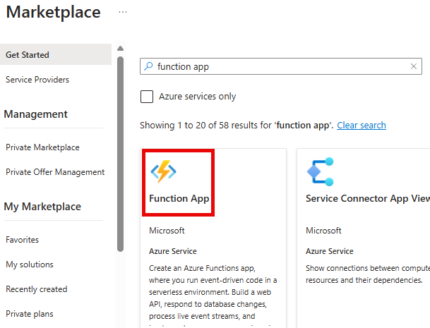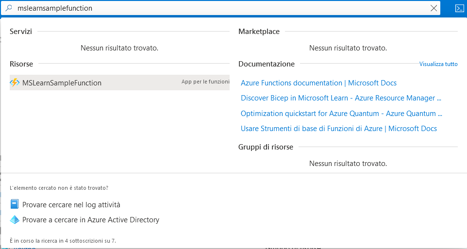 Per verificare che la funzione sia stata pubblicata, accedere al portale di Azure. È possibile selezionarlo manualmente dal gruppo di risorse specificato al momento della creazione della funzione. In alternativa, è possibile cercarlo per nome nel portale di Azure, come mostrato nell'immagine seguente.