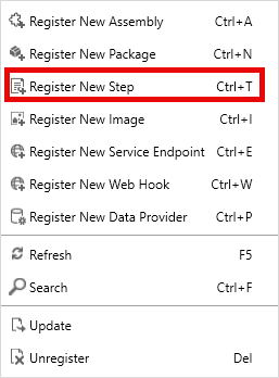 Registrare un nuovo passaggio che pubblica un messaggio alla creazione di un nuovo account. Registrare un nuovo passaggio facendo clic con il pulsante destro del mouse sul nuovo assembly di webhook e selezionando Registra nuovo passaggio.