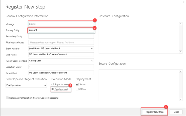 Selezionare Crea per Messaggio, selezionare account per Entità primaria, selezionare Sincrona per Modalità di esecuzione, quindi selezionare il pulsante Registra nuovo passaggio. Poiché si crea questo webhook per l'esecuzione sincrona, durante la registrazione del nuovo passaggio assicurarsi che il flag sia impostato.