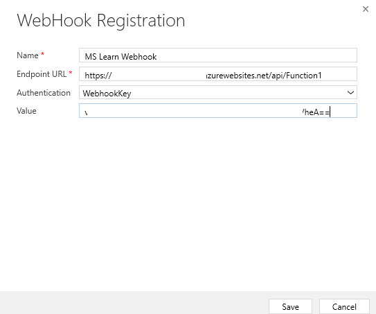 https://[AppServiceUrl].azurewebsites.net/api/MsLearnFunction?code=[WebhookKey]Tagliare e incollare il valore della stringa di query del codice dall'URL copiato e inserirlo nella sezione Valore della stringa di registrazione del webhook (assicurarsi di rimuovere code=). Selezionare Salva.