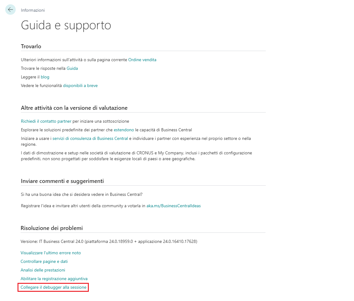 Andare alla pagina Guida e supporto e scegliere il collegamento Allega debugger a questa sessione sotto la sezione Risoluzione dei problemi.