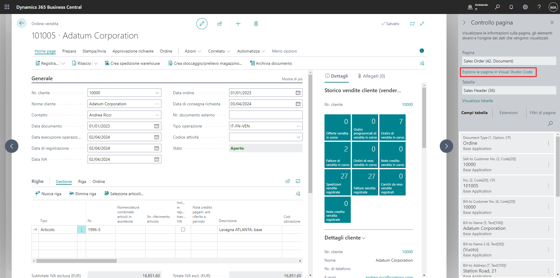 Da una pagina di Web Business Central Web client è possibile aprire la pagina Controllo pagina ed esplorare il codice sottostante in Visual Studio Code.