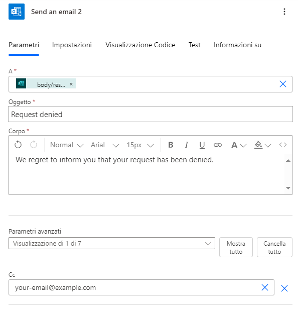 Sebbene i passaggi proposti del flusso siano simili a livello generale, i singoli passaggi sono più dettagliati. Ad esempio, il messaggio e-mail inviato al richiedente quando l'approvazione viene negata ora contiene già un messaggio.